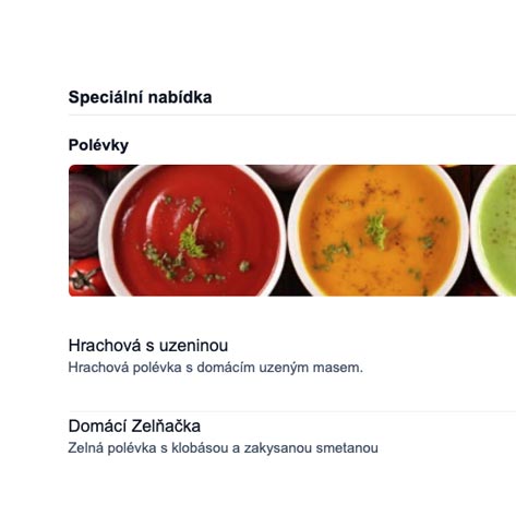 V našem přehledném builderu si poskládáš menu přesně podle svých potřeb. Přidávej sekce, položky, bannery i fotky jídel a vytvoř si prezentaci, která bude působit profesionálně a přehledně.